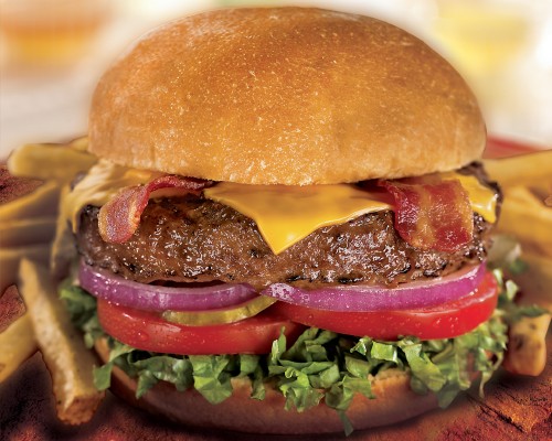 Deliciosa hamburguesa acompañada de tocino crujiente y queso americano derretido.