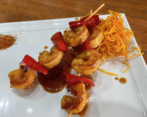Brocheta de camaron con piña, asadas y marinada con salsa dulce.
