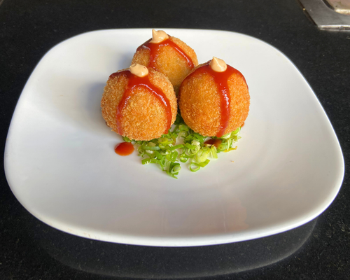 Descripción: Tres bolas de arroz mezclado con cebollín, cebolla, queso crema y chiles toreados; empanizadas y bañadas con salsa.