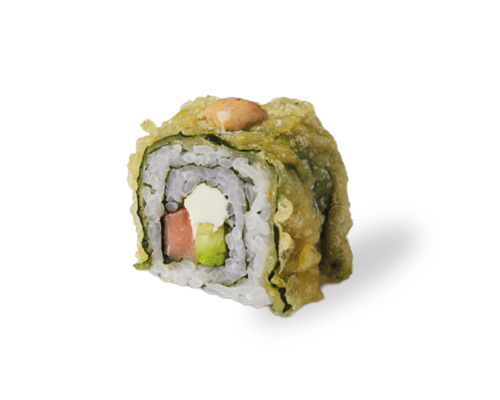 Descripcion: Espinaca capeada por fuera, sake fresco, aguacate y queso crema por dentro; servido con salsa Itto y salsa chipotle.