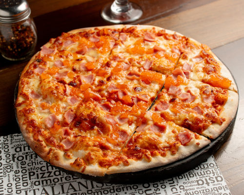 Salsa de tomate, mozzarella, jamón, piña y aceite.