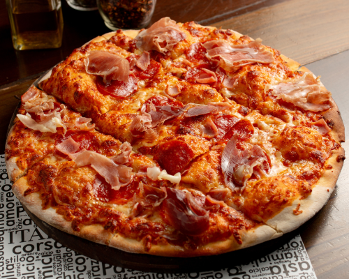 Salsa de tomate, mozzarella, pepperoni, jamón, prosciutto y aceite.