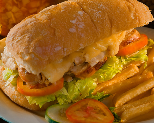 Pechuga de Pollo a la plancha en rebanadas, lechuga, tomate coronado con queso mozarella derretido y servido en pan tostado ciabatta y aderezo de la casa o aderezo chipotle, acompañado de papas fritas o papas campesinas.