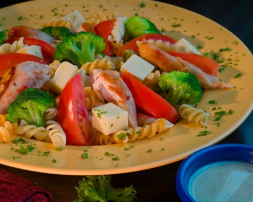 Combinación de pasta y vegetales acompañada de jugosos cuadritos de pechuga de pollo.