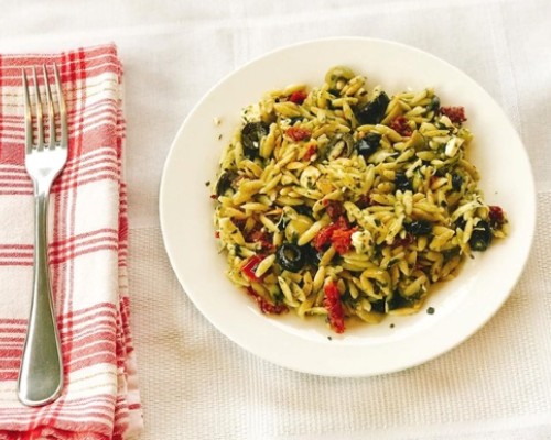 Nuestro orzo griego es una explosión de sabores, la opción perfecta para acompañar cualquier carne o marisco, o simplemente para comerlo solito. Compuesto de pasta orzo, tomates deshidratados, queso feta, aceitunas verdes y negras y nuestro delicioso pesto casero.