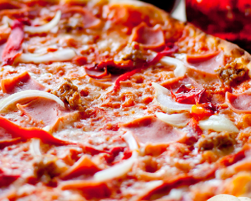 Salsa de tomate, mozarrella, chorizo italiano, jamón, cebolla y chile dulce.
