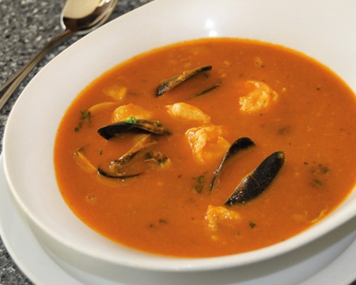 Consomé de marisco con calamares, mejillones, almejas, camarones, perejil, ajo, cebolla y vino blanco.