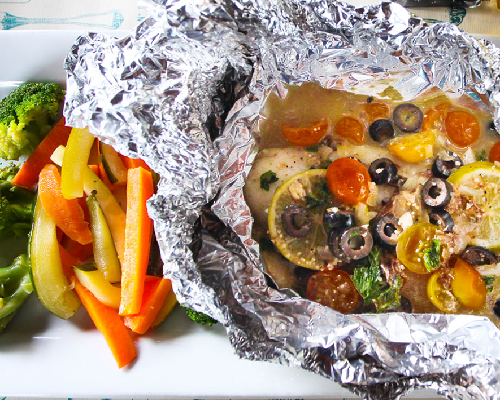 Cocinado en horno de leña con vino, especies, tomate cherry, aceitunas negras, cebolla, limón, aceite de oliva entra virgen, vegetales y papas salteadas.
