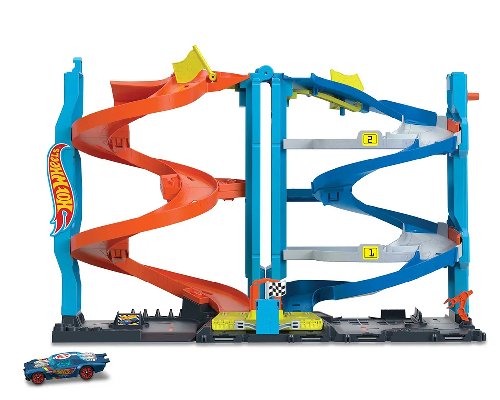 Experimenta las épicas carreras 2 en 1 con la Torre de Carreras con Doble Altura transformable de City de Hot Wheels®. Este innovador set de juego se transforma de pistas de competencia lado a lado con puertas de inicio justo en una pista individual de más de 66 centímetros de alto. Los detalles de la pista en la base fomentan las narrativas independientes y, con 1 vehículo Hot Wheels® incluido, es un regalo perfecto para niños de 4 años en adelante. Conéctalo a otros sets de juego para extender la carrera y la emoción. Los sets adicionales se venden por separado. Los colores y las decoraciones pueden variar.