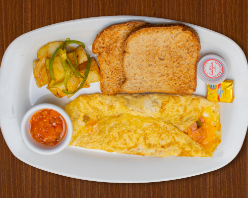 Incluye: Huevo, jamón, queso cheddar, tomate, cebolla, chiltoma, papas salteadas, salsa ranchera y tostadas con jalea y mantequilla.
