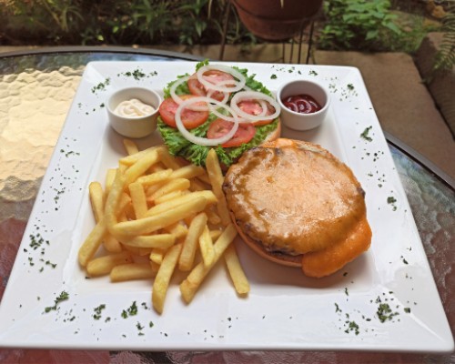 Hamburguesa de res con queso cheddar - Café de Arte (GRANADA)