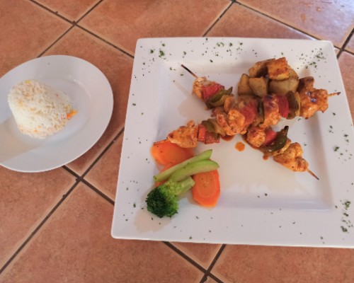 Incluye: Dos brochetas de pollo con cebolla, chiltoma y tomate, papa gratinada, vegetales salteados y arroz.