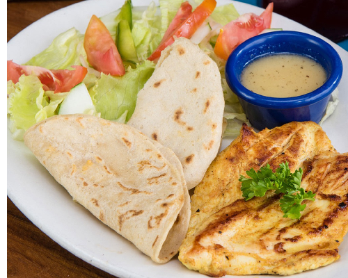 Pollo a la plancha acompañado de ensalada campesina y tortilla.