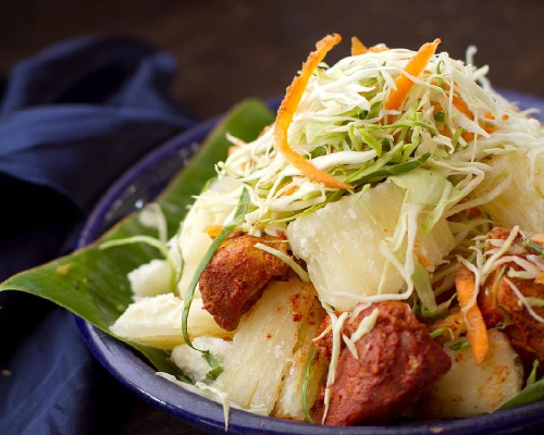 Cerdo marinado, servido con yuca y ensalada de repollo.