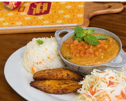 Guiso de carne de res, con condimentos nicas, acompañado de maduro frito, arroz y ensalada de repollo.