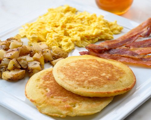 3 huevos al gusto, bacon, papas salteadas y pancakes.