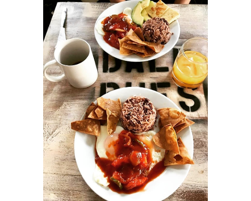 2 huevos, tostadas y aguacate ó tocino y papas ó ensalda.
