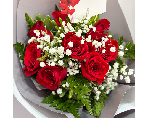 Hermoso bouquet de 8 unidades de rosas rojas con nubes y relleno verde.