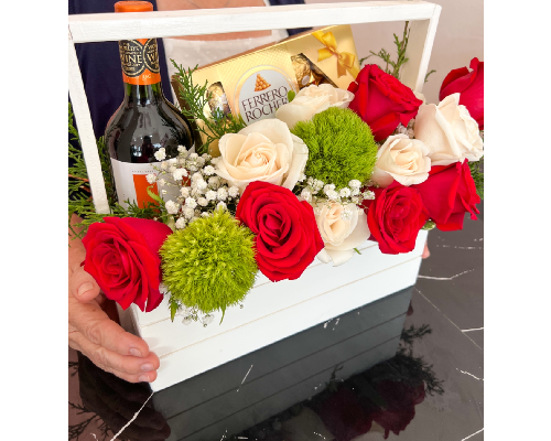 Este arreglo incluye 10 rosas mixtas, rojas y crema, gypsophila blanca, decoraciones verdes, vino tinto y chocolates Ferrero Rocher..
