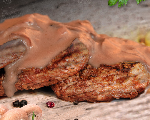 Medallones a la parrilla en salsa de hongos frescos, vino y crema de trufa acompañada con vegetales y papas salteadas.
