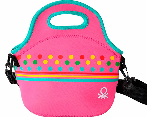 Bolsa de almuerzo de neopreno rosa con patrón innovador. Perfecto para viajar: almacenar frutas, sándwiches, platos calientes. De material fácil de limpiar. Buen aislamiento. Dimensiones aprox: 30x17x30 cm.