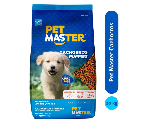 La comida Pet Master de 9 kg (19.8 lb) para perros cachorros de 2 a 18 meses; es un alimento seco que está formulada con proteínas seleccionadas e ingredientes de alta calidad, con proteínas fácilmente digeribles, granos saludables y pollo deshuesado, suplemento de vitamina A, biotina y suplemento de vitamina B12, lo que le permitirá a tu mascota mantenerse saludable y tener el pelaje suave y brillante. Almacena el bulto de comida en lugar seco para mantener su alimento fresco en cada comida.