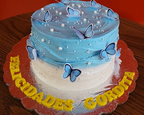 Pastel de merengue. Escoger torta vainilla o chocolate y el relleno entre dulce de leche, mermelada de guayaba o piña.