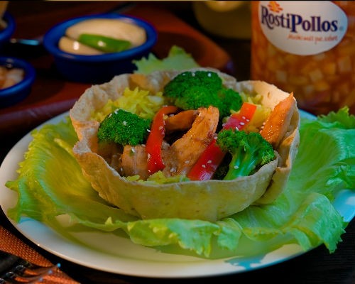 Pechuga de pollo, brócoli, chiltoma, semillas de ajonjolí, arroz amarillo servido en una canasta de tortilla de harina acompañado con salsa Teriyaki.