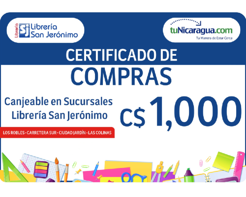 Su Certificado de Regalo Librería San Jerónimo puede utilizarse para hacer compras en las sucursales de Managua ubicados en Los Robles, Carretera Sur, Ciudad Jardín y Las Colinas. No puede canjearse por efectivo. No hay reposición después de su fecha de vencimiento o por pérdida. El uso de este certificado de regalo implica la aceptación de estos términos y condiciones. Para obtener más información acerca del Certificado de Regalo de Librería San Jerónimo por favor llame al 1-305-359-3528 o al 2278-8074 en Nicaragua. Válido solamente en Nicaragua.
