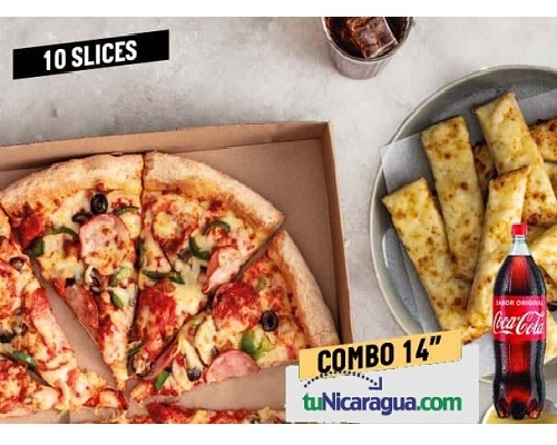 1 Pizza de 14 Pulgadas de 10 slice + 1 Cheesesticks mediano (8unid) + 1 Gaseosa 2 litros