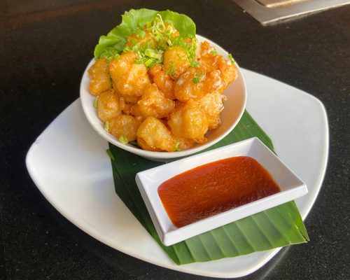 Descripción: Camarones al tempura, aderezados con salsas.