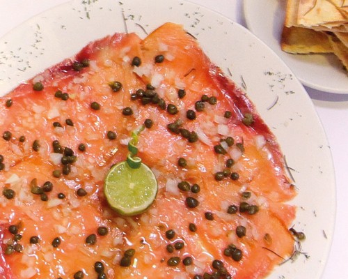 Finas lonjas de salmón ahumado con alcaparras, cebolla picada, aceite de oliva extra virgen y limón.