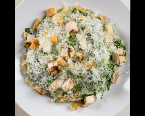 Lechuga, aderezo cesar hecho en casa, pollo a la parrilla, parmesano y cruotones.