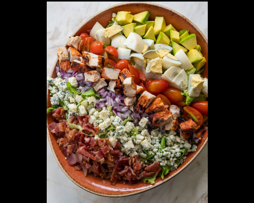 Mix de lechugas, bacon, tomate cherry, cebolla morada, aguacate, huevo, blue cheese, pollo, aderezo balsámico.