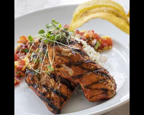 Pollo marinado con achiote al grill, pico de gallo con piña y jalapeño, tajadas de plátano, opción de arroz, vegetales salteados o ensalada verde.
