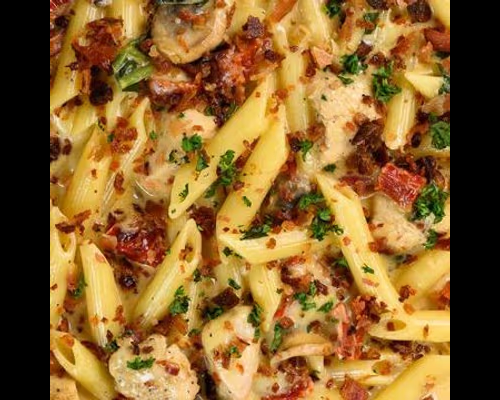Pasta penne con pollo, hongos frescos, espinaca, cebolla y tomate deshidratado, con salsa cremosa y crumbs de bacón.
