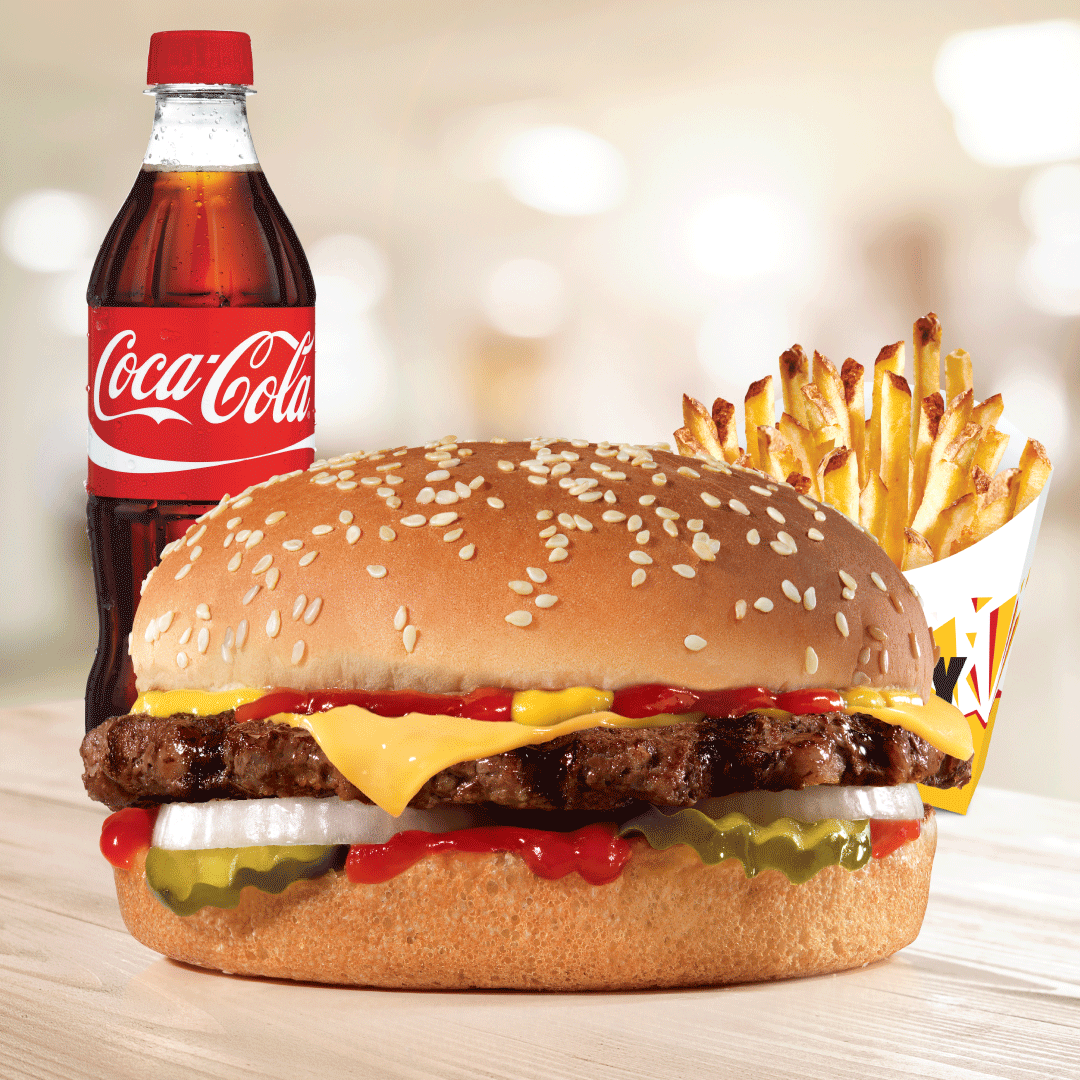 Pan con ajonjolí, salsa de tomate, mostaza, torta de carne 100% de res, cebolla, pepinillo. Incluye papa mediana y bebida 500 ml.