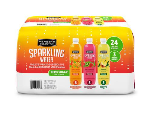 Disfruta del más fresco y delicioso sabor del agua con gas de Member's Selection. Vienen 3 sabores. Contiene: 8 Naranja Mango + 8 Kiwi Fresa + 8 Piña. Sin azúcar.