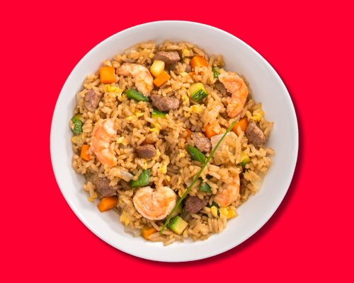 Descripción: Arroz frito con verduras, huevo, carnes y camarón.